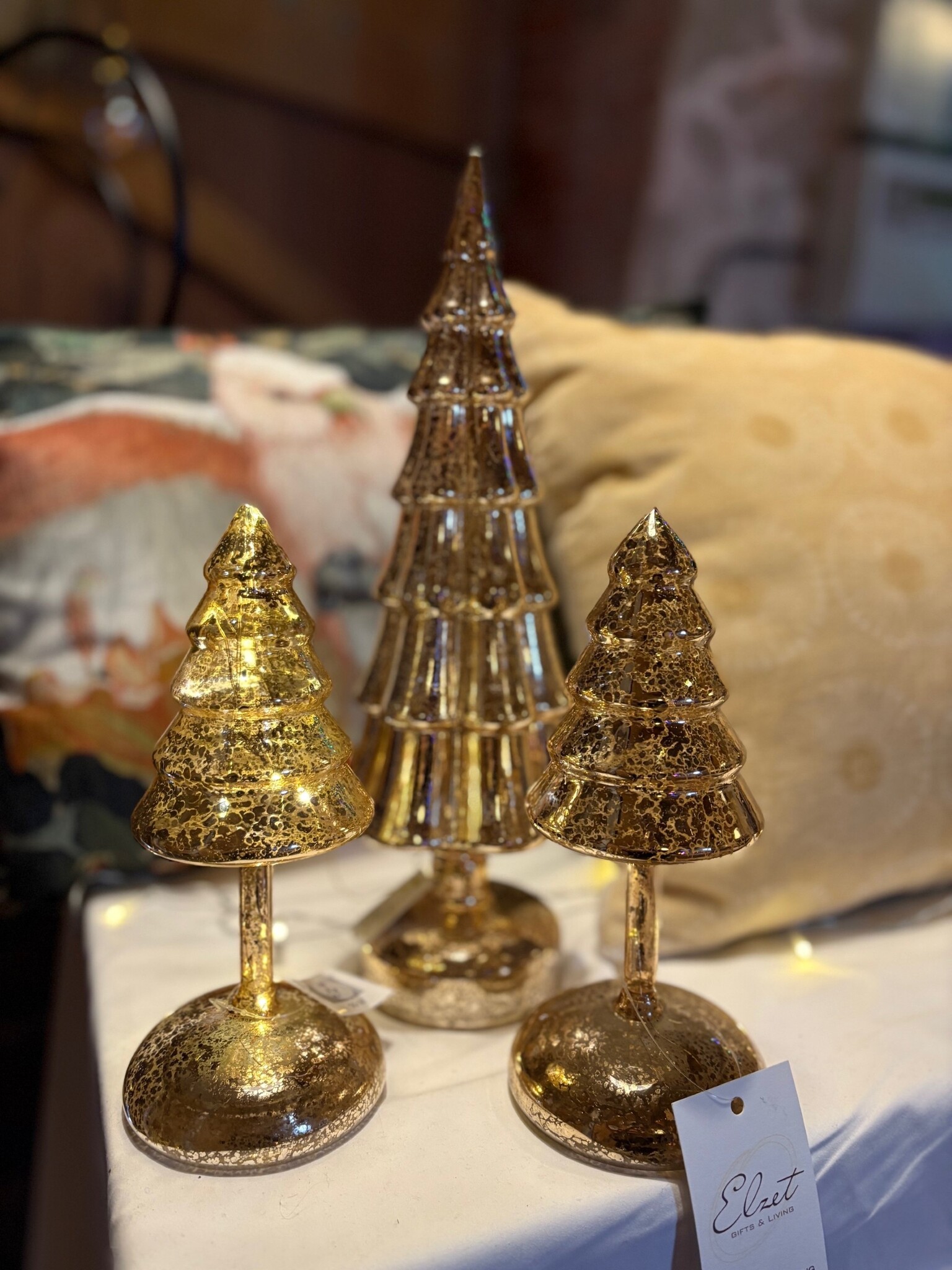 Elegante kerstboomlampen op voet (L & M-formaat) in mooie goudkleur, geeft echt een prachtig difuus licht. Superaanvulling op de kersttafel, echt onmisbare kerstdecoratie! Werkt op batterijen (niet incluis).