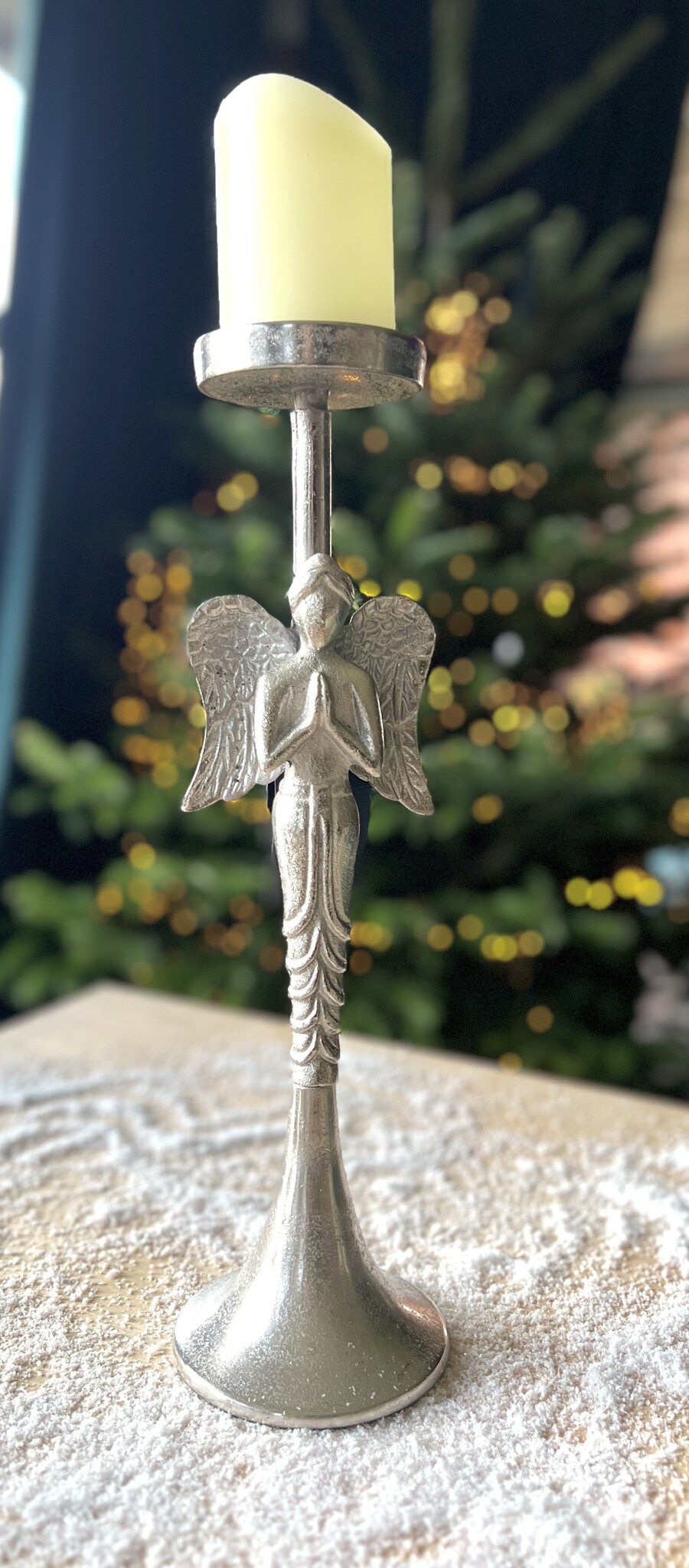 Prachtig bewerkte, gevleugelde engel kaarsenhouder. Bijna statige kaarsenhouder in Raw Nickle van Diga Colmore, echte blikvanger!!