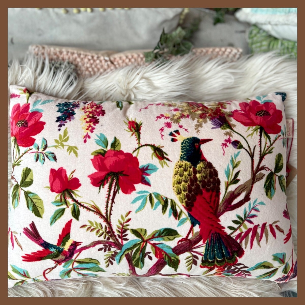 Prachtig woonkussen van het mooie Imbarro in onze favoriete Paradise print, L formaat, nu in fris mint, roze (blossom) of ecru. Ook in donkerblauw M-formaat. Heerlijk fluweelzacht kussen, aan voor en achterzijde bedrukt.