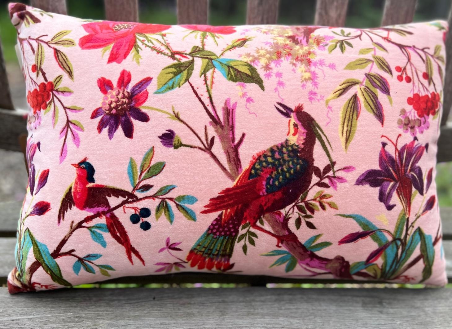 Prachtig woonkussen van het mooie Imbarro in onze favoriete Paradise print, nu in fris mint of roze. Heerlijk fluweelzacht kussen, aan voor en achterzijde bedrukt.